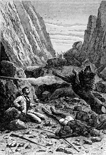 As the young astronomer lay musing over all these things, and asking himself a thousand questions which he could not answer, his eyelids became heavy, and at length he slept soundly. When he awoke, the sun was already hidden behind the western hills, whose picturesque outline stood out sharply against the bright horizon. Some gnawings of hunger told him that supper-time was near; it was, in fact, six o'clock, and just the hour for returning to the waggon at the bottom of the valley. At that very moment a report resounded from a grove of arborescent heaths, from twelve to fifteen feet high, which was growing along the slope of the hills on the right. Almost immediately the bushman and Top made their appearance at the edge of the wood, the former dragging behind him the animal that he had just shot. "Come, come, master purveyor!" cried Emery, "what have you got for supper?"