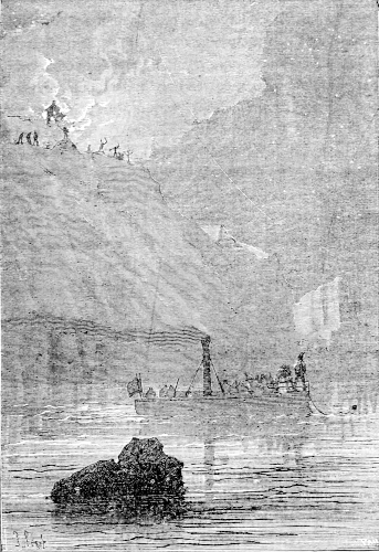 Looking in the direction indicated by the bushman, Emery could just see a light streak rolling round the bend of the river: there was no longer any doubt. The vessel advanced rapidly, and he could soon make out the funnel pouring forth a torrent of black smoke mingling with white steam. They had evidently made up their fires to increase their speed, so as to reach the appointed place on the exact day. The vessel was still about seven miles from the Falls of Morgheda. It was then twelve o'clock, and as it was not a good place for landing, the astronomer determined to return to the foot of the cataract: he told his plan to the hunter, who only answered by turning back along the path he had just cleared along the left bank of the stream. Emery followed, and, turning round for the last time at a bend in the river, saw the British flag floating from the stern of the vessel. The return to the falls was soon effected, and in an hour's time the bushman and the astronomer halted a quarter of a mile below the cataract; for there the shore, hollowed into a semicircle, formed a little creek, and as the water was deep right up to the bank, the steamboat could easily land its passengers. The vessel could not be far off now, and it had certainly gained on the two pedestrians, although they had walked so fast; it was not yet in sight, for the lofty trees which hung quite over the river-banks into the water, and the slope of the banks themselves, did not allow of an extensive view. But although they could not hear the sound made by the steam, the shrill whistle of the machinery broke in distinctly on the monotonous roar of the cataract; and as this whistling continued, it was evident that it was a signal from the boat to announce its arrival near the falls. The hunter replied by letting off his gun, the report being repeated with a crash by the echoes of the shore. At last the vessel was in sight, and William Emery and his companion were seen by those on board. At a sign from the astronomer the vessel turned, and glided quietly alongside the bank; a rope was thrown ashore, which the bushman seized and twisted round the broken stump of a tree, and immediately a tall man sprang lightly on to the bank, and went towards the astronomer, whilst his companions landed in their turn. William Emery also advanced to meet the stranger, saying inquiringly, "Colonel Everest?"