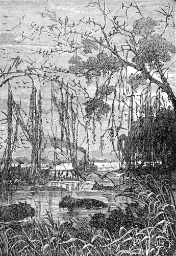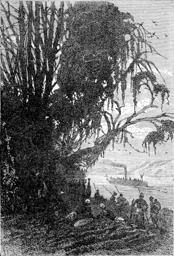 "Let us stop and rest here," said the astronomer; "I haven't your hunter's legs, Mokoum, and am more used to the starry paths of the heavens than to those on terra firma; so let us have a rest; we can see three or four miles down the river from here, and if the steamer should turn that last bend we are sure to see it."