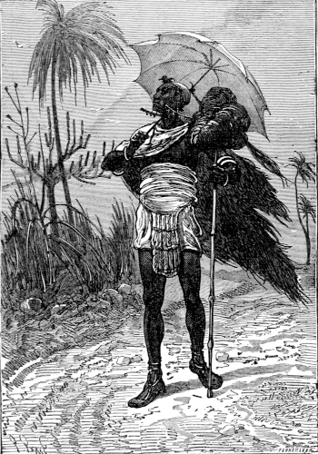 The bushman was no longer a savage like the rest of his race, the ancient Laquas; for, born of an English father and a Hottentot mother, the half-breed, through his association with strangers, had gained more than he had lost, and spoke the paternal tongue fluently. His costume, half-Hottentot, half-European, consisted of a red flannel shirt, a loose coat and breeches of antelope hide, and leggings made of the skin of a wild cat; from his neck hung a little bag containing a knife, a pipe, and some tobacco; he wore on his head a kind of skull-cap of sheep-skin; a belt, made from the thick thong of some wild animal, encircled his waist; and on his naked wrists were rings of ivory, wrought with remarkable skill. From his shoulders flowed a "kross," a kind of hanging mantle, cut out of a tiger's skin, and falling as low as the knees. A dog of native breed was sleeping near him, while he himself was smoking a bone pipe in quick puffs, giving unequivocal signs of impatience.