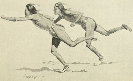The reader will inquire whether there was any real beauty, as we judge it, among these Indians. Yes, there was; at least there were good looks if there was not beauty. I saw perhaps a dozen fine-looking men, half a dozen attractive girls, and something like a hundred children of varying degrees of comeliness—pleasing, pretty, or beautiful. I had some jolly romps with the children, and so came to know that their faces and arms met my touch with the smoothness and softness of the flesh of our own little ones at home. I was surprised at this; indeed, the skin of the boys was of the texture of velvet. The madcap urchins, what riotous fun they were having! They flung arrows and darts, ran races and wrestled, and in some of their play they fairly swarmed all over one a[38]nother, until at times one lad would be buried in the thick of a writhing mass of legs and arms several feet in depth. Some of the boys wore only "G-strings" (as, for some reason, the breech-clout is commonly called on the prairie), but others were wrapped in old blankets, and the larger ones were already wearing the Blackfoot plume-lock, or tuft of hair tied and trained to stand erect above the forehead. The babies within the tepees were clad only in their complexions.