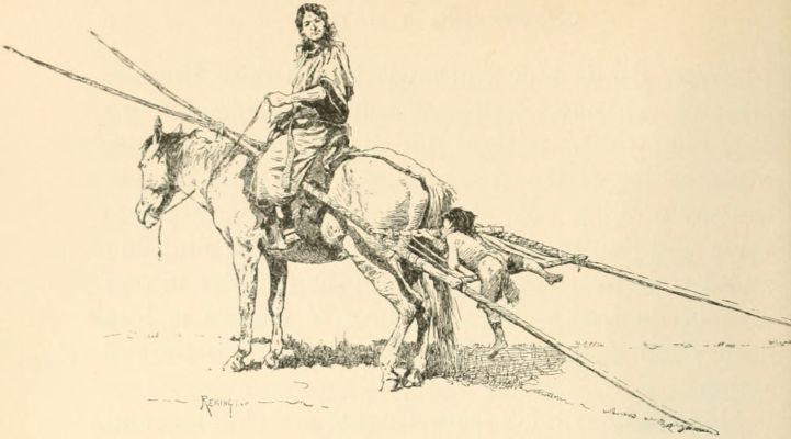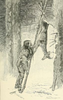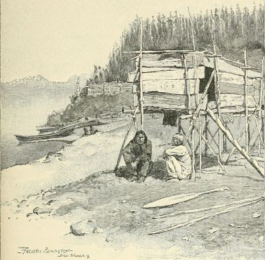 Presently, as we journeyed, a little line of sand-hills came into view. They formed the Blackfoot cemetery. We saw the "tepees of the dead" here and there on the knolls, some new and perfect, some old and weather-stained, some showing mere tatters of cotton flapping on the poles, and still others only skeleton tents, the poles remaining and the cotton covering gone completely. We knew what we would see if we looked into those "dead tepees" (being careful to approach fr[20]om the windward side). We would see, lying on the ground or raised upon a framework, a bundle that would be narrow at top and bottom, and broad in the middle—an Indian's body rolled up in a sheet of cotton, with his best bead-work and blanket and gun in the bundle, and near by a kettle and some dried meat and corn-meal against his feeling hungry on his long journey to the hereafter. As one or two of the tepees were new, we expected to see some family in mourning; and, sure enough, when we reached the great sheer-sided gutter which the Bow River has dug for its course through the plains, we halted our horse and looked down upon a lonely trio of tepees, with children playing around them and women squatted by the entrances. Three families had lost members, and were sequestered there in abject surrender to grief.