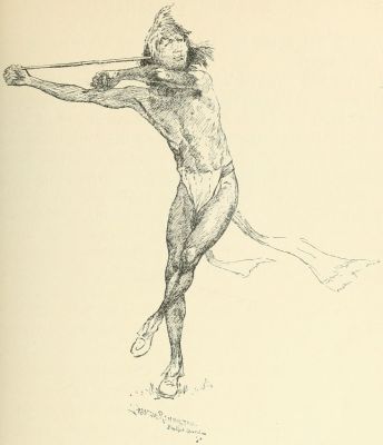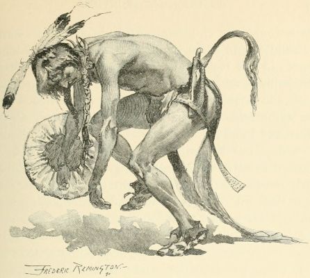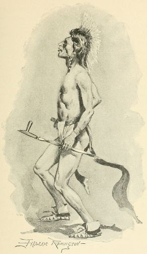 Only half a dozen men wore hats—mainly cowboy hats decked with feathers. Many carried rifles, which they used with one hand. Others brought out bows and arrows, lances decked with feathers or ribbons, poles hung with colored cloths, great shields brilliantly painted and fringed. Every visible inch of each warrior was painted, the naked ones being ringed, streaked, and striped from head to foot. I would have to catalogue the possessions of the whole nation to tell all that they wore between the brass rings in their hair and the cartridge-belts at their waists, and thus down to their beautiful moccasins.