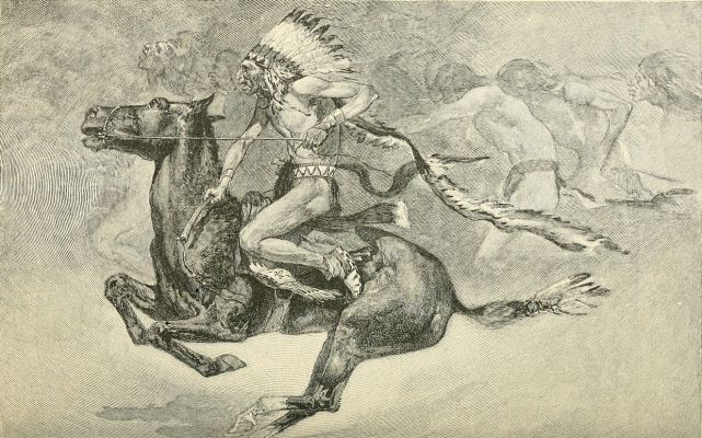 And then came the grand spectacle. The vast plain was forgotten, and the great campus within the circle of tents was transformed into a theatre. The scene was a setting of white and red tents that threw their clear-cut outlines against a matchless blue sky. The audience was composed of four white men and the Indian boys, who were flung about by the startled horses they were holding for us. The players were the gorgeous cavalrymen of nature, circling before their women and old men and children, themselves plumed like unheard-of tropical birds, the others displaying the minor splendor of the kaleidoscope. The play was "The Pony War-dance, or the Departure for Battle." The acting was fierce; not like the conduct of a mimic battle on our stage, but performed with the desperate zest of men who hope for distinction in war, and [46]may not trifle about it. It had the earnestness of a challenged man who tries the foils with a tutor. It was impressive, inspiring, at times wildly exciting.