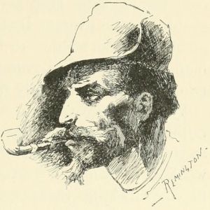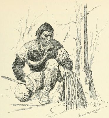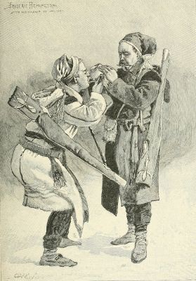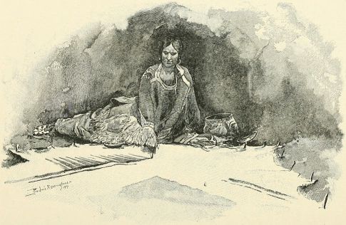 Mr. Remington was anxious to paint Old Sun and his squaw, particularly the latter, and he easily obtained permission, although when the time for the mysterious ordeal arrived next day the old chief was greatly troubled in his superstitious old brain lest some mischief would befall him through the medium of the painting. To the Indian mind the sun, which they worship, has magical, even devilish, powers, and Old Sun developed a fear that the orb of day might "work on his picture" and cause him to die. Fortunately I found in Mr. L'Hereux, the interpreter, a person who had undergone the process without dire consequences, was willing to undergo it again, and who added that his father and mother had submitted to the operation, and yet had lived to a yellow old age. When Old Sun [24]brought his wife to sit for her portrait I put all etiquette to shame in staring at her, as you will all the more readily believe when you know something of her history.