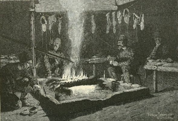 This structure was of a size to accommodate two hundred men at once. Two tables ran the length of the unbroken interior—tables made roughly of the slabs or outside boards from a saw-mill. The benches were huge tree-trunks spiked fast upon stumps. There was a bench on either side of each table, and the places for the men were each set with a tin cup and a tin pie plate. The bread was heaped high on wooden platters, and all the condiments—catsup, vinegar, mustard, pepper, and salt—were in cans that had once held condensed milk. The cooks worked in an open-ended extension at the rear of the great room. The rule is to have one cook and two "cookees" to each sixty men.