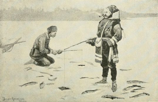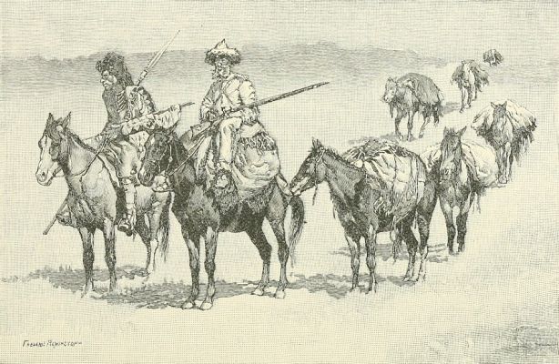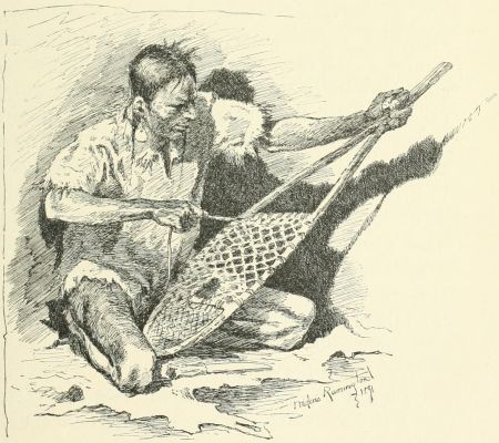 When we entered the big tepee we saw twenty-one men seated in a circle against the wall and facing the open centre, where the ground was blackened by the ashes of former fires. Three Bulls sat exactly opposite the queer door, a horseshoe-shaped hole reaching two feet above the ground, and extended by the partly loosened lacing that held the edges of the tent-covering together. Mr. L'Hereux, the interpreter, made a long speech in introducing each of us. We stood in the middle of the ring, and the chief punctuated the interpreter's remarks with that queer Indian grunt which it has ever been the custom to spell "ugh," but which you may imitate exactly if you will try to say "Ha" through your nose while your mouth is closed. As Mr. L'Hereux is a great talker, and is[29] of a poetic nature, there is no telling what wild fancy of his active brain he invented concerning us, but he made a friendly talk, and that was what we wanted. As each speech closed, Three Bulls lurched forward just enough to make the putting out of his hand a gracious act, yet not enough to disturb his dignity. After each salutation he pointed out a seat for the one with whom he had shaken hands. He announced to the council in their language that we were good men, whereat the council uttered a single "Ha" through its twenty-one noses. If you had seen the rigid stateliness of Three Bulls, and had felt the frigid self-possession of the twenty-one ramrod-mannered under-chiefs, as well as the deference which was in the tones of the other white men in our company, you would comprehend that we were made to feel at once honored and subordinate. Altogether we made an odd picture: a circle of men seated tailor fashion, and my own and Mr. Remington's black shoes marring the gaudy ring of yellow moccasins in front of the savages, as they sat in their colored blankets and fringed and befeathered gear, each with the calf of one leg crossed before the shin of the other.