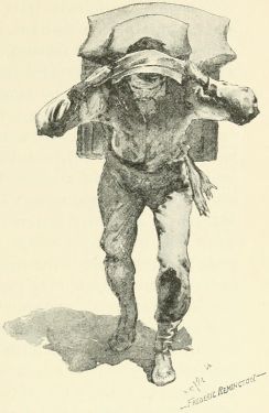 Another one of the tents was that of the "boss packer." He superintended the transportation of supplies on the pack-trail. This "job of 200 men," as Dunn styled his camp, employed thirty pack horses and mules. The pack-trains consisted of a "bell-horse" and boy, and six horses following. Each animal was rated to carry a burden of 400 pounds of dead weight, and to require three quarts of meal three times a day.