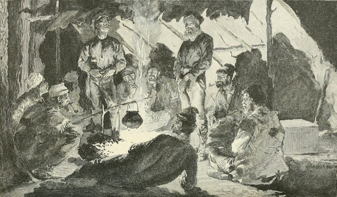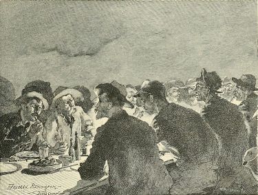 While I was a new arrival just undergoing introduction, the men, who had come in from work, and who had "washed up" in the little creeks and at the river bank, began to assemble in the "grub tent" for supper. They were especially interesting to me because there was every reason to believe that they formed an assembly as typical of the human flotsam of the border as ever was gathered on the continent. Very few were what might be called born laborers; on the contrary, they were mainly men of higher origin who had failed in older civilizations; outlaws from the States; men who had hoped for a gold-mine until hope was all but dead; men in the first flush of the gold fever; ne'er-do-wells; and here and there a working-man by training. They ate as a good many other sorts of men do,[317] with great rapidity, little etiquette, and just enough unselfishness to pass each other the bread. It was noticeable that they seemed to have no time for talking. Certainly they had earned the right to be hungry, and the food was good and plentiful.