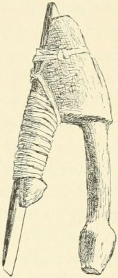 The redistribution accomplished, Three Bulls wore a grin of satisfaction, and one chief who had lost a great [33]pile of presents, and who got nothing at all by the second division, stalked solemnly out of the tent, through not until Three Bulls had tossed the plugs of tobacco to all the men around the circle, precisely as he might have thrown bones to dogs, but always observing a certain order in making each round with the plugs. All were thus served according to their rank. Then Three Bulls rummaged with one hand behind him in the grass, and fetched forward a great pipe with a stone bowl and wooden handle—a sort of chopping-block of wood—and a large long-bladed knife. Taking a plug of tobacco in one hand and the knife in the other, he pared off enough tobacco to fill the pipe. Then he filled it, and passed it, stem foremost, to a young man on the left-hand side of the tepee. The superior chiefs all sat on the right-hand side. The young man knew that he had been chosen to perform the menial act of lighting the pipe, and he lighted it, pulling two or three whiffs of smoke to insure a good coal of fire in it before passing it back—though why it was not considered a more menial task to cut the tobacco and fill the pipe than to light it I don't know.