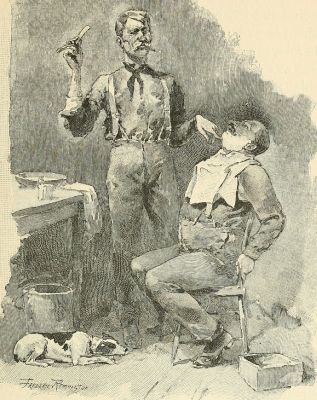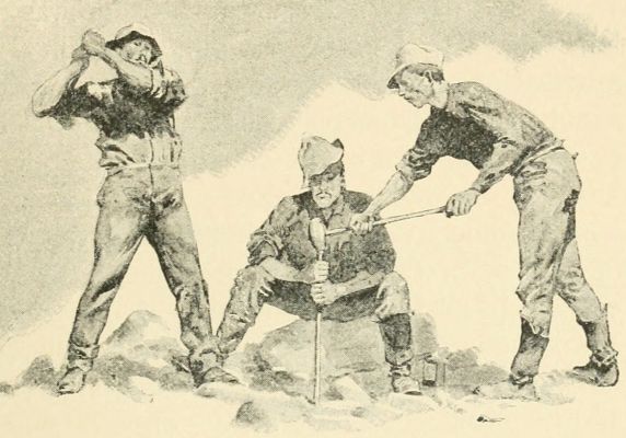 But those who thought of active pleasure were few indeed. Theirs was killing work, the most severe kind, and performed under the broiling sun, that at high mountain altitudes sends the mercury above 100 on every summer's day, and makes itself felt as if the rarefied atmosphere was no atmosphere at all. After a long day at the drill or the pick or shovel in such a climate, it was only natural that the men should, with a common impulse, seek first the solace of their pipes, and then of the shake-downs in their tents. I did not know until the next morning how severely their systems were strained; but it happened at sunrise on that day that I was at my ablutions on the edge of the river when Dan Dunn's gong turned the silent forest into a bedlam. It was called the seven-o'clock alarum, and was rung two hours earlier than that hour, so that the men might take two hours after dinner out of the heat of the day, "else the sun would kill them," Dunn said. This was apparently his device, and he kept up the transparent deception by having every clock and watch in the camp set two hours out of time.