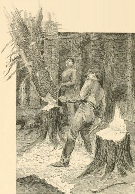 Slowly, behind the trail-cutters, follow the "right-of-way" men. These are axemen also. All that they do is to cut the trees down and drag them out of the way.
