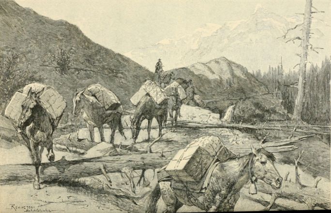 We made the journey from Sproat's Landing to the Kootenay River upon a sorry quartet of pack-horses that were at other times employed to carry provisions and material to the construction camps. They were of the kind of horses known all over the West as "cayuses." The word is the name of a once notable tribe of Indians in what is now the State of Washington. To these Indians is credited the introduction of this small and peculiar breed of horses, but many persons in the West think the horses get the nickname because of a humorous fancy begotten of their wildness, a[301]nd suggesting that they are only part horses and part coyotes. But all the wildness and the characteristic "bucking" had long since been "packed" out of these poor creatures, and they needed the whip frequently to urge them upon a slow progress. Kirkup was going his rounds, and accompanied us on our journey of less than twenty miles to the Kootenay River. On the way one saw every stage in the construction of a railway. The process of development was reversed as we travelled, because the work had been pushed well along where we started, and was but at its commencement where we ended our trip. At the landing half a mile or more of the railroad had been completed, even to the addition of a locomotive and two gondola cars. Beyond the little strip of rails was a long reach of graded road-bed, and so the progress of the work dwindled, until at last there was little more than the trail-cutters' path to mark what had been determined as the "right of way."