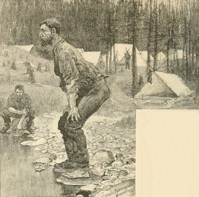 With the sounding of the gong the men began to appear outside the little tents in which they slept in couples. They came stumbling down the bluff to wash in the river, [325]and of all the pitiful sights I ever saw, they presented one of the worst; of all the straining and racking and exhaustion that ever hard labor gave to men, they exhibited the utmost. They were but half awakened, and they moved so painfully and stiffly that I imagined I could hear their bones creak. I have seen spavined work-horses turned out to die that moved precisely as these men did. It was shocking to see them hobble over the rough ground; it was pitiful to watch them as they attempted to straighten their stiffened bodies after they had been bent double over the water. They gained erectness by slow jolts, as if their joints were of iron that had rusted. Of course they soon regained whatever elasticity nature had left them, and were themselves for the day—an active, muscular force of men. But that early morning sight of them was not such a spectacle as a right-minded man enjoys seeing his fellows take part in.