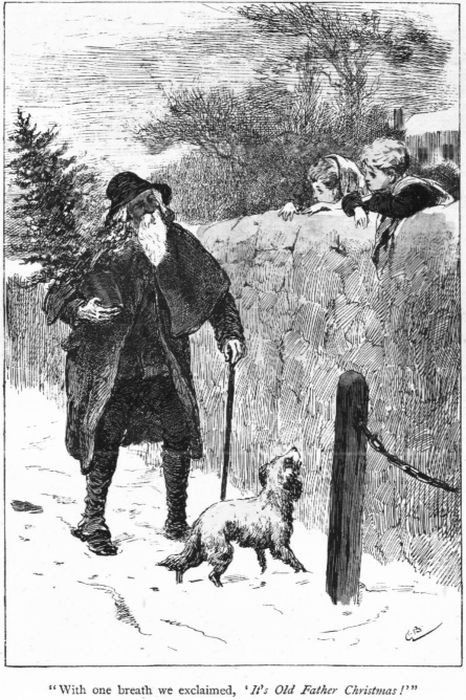 “This idea was rather favoured by the fact that the dog led us up the lane. Only a little way; then he stopped by something lying in the ditch—and once more we cried in the same breath, ‘It’s Old Father Christmas!’”