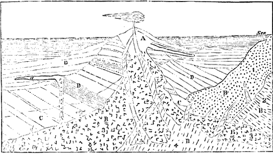 | 2. | The four divisions of rocks, and their relative positions. A, Volcanic Rocks. B, Granite. 1, 2, 3, 4, Granite of different ages. C, Metamorphic Rocks. D, Fossiliferous Rocks. (Lyell.) | ||||