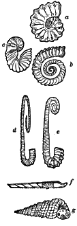 | 14. | Curved Cephalopoda, a, Ammonite; b, Crioceras; c, Scaphite; d, Ancyloceras; e, Hamite; f, Baculite; g, Turrilite. (Agassiz and Gould.) | ||||