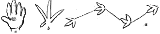 | 29. | b, Bird tracks in the Conn. River Sandstone, a, Consecutive tracks; c, Track of Cheirotherium (probably a reptile), Penn. and Germany. | ||||