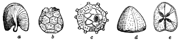 | 35. | a, Diploctenium cordatum; b, Marsupites; c, Salenia; d, Galerites; e, Micraster cor-anguinum. (Agassiz & Gould.) | ||||