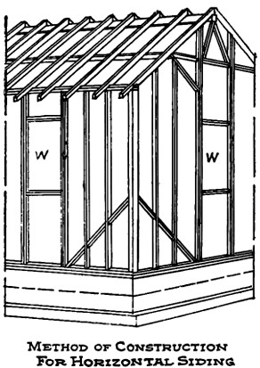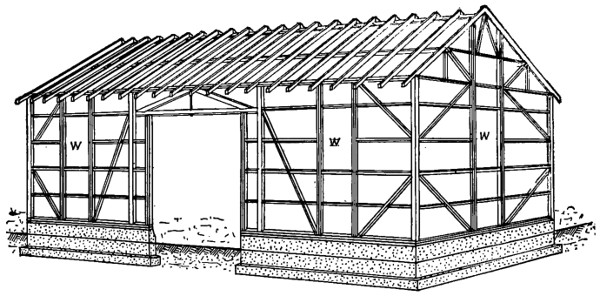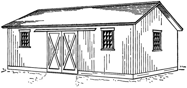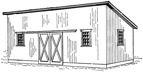 Only one wide sliding door is shown, though another smaller door can be inserted if desired. The truss construction shown in Fig. 10 is used above the wide door. Either vertical or horizontal siding may be used, the former being simple and satisfactory construction. The front wall may be omitted in localities where inclement weather is uncommon.