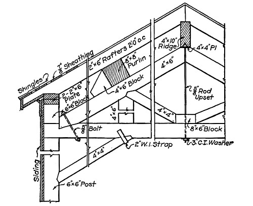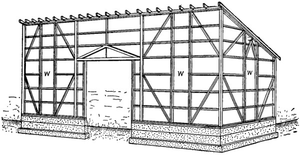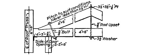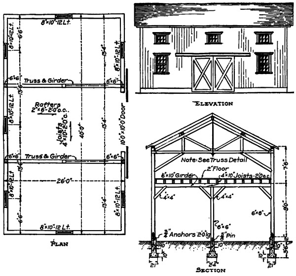 Strong framing is necessary to insure durability in this structure. Members may be solid or built up. Details of one form of roof truss are shown in Fig. 11. Note solid foundation. Doors may be located to suit requirements.