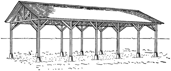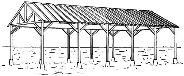 In preparing the design for machine sheds one of the first considerations is that of economy. A machine shed is a building which is almost always used for no other purpose than to shelter machinery. It is not like a bin for the storage of grain where strength is an exceedingly important factor nor is it like a barn where so many operations are carried on within; consequently the simplest and cheapest structure that is consistent with reasonable durability is the one that is the most advisable. Wood is a product available in every section and is the cheapest and most suitable material for the construction of an implement shed.