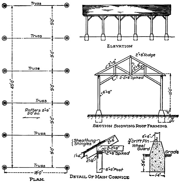Framing of 6x6 posts, thoroughly braced. Ends may be boarded or left open as desired. Foundation piers act as wheel guards. Width between posts can be varied to suit requirements.
