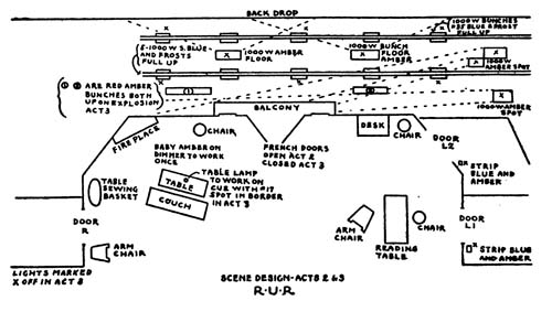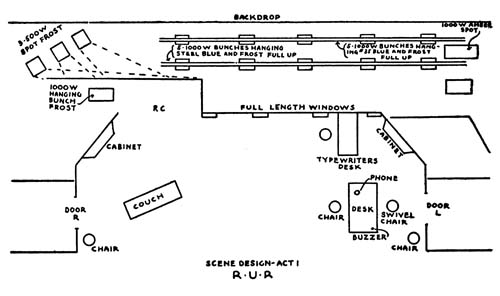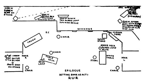 A frost 1000-watt spot (frost) on stand off stage are lighted and blinded at rise. The blinds are[94] opened when Radius exits. The light floods the room through door at R. The blinds are closed when the Robot exits on cue: “The Robots are stronger than you.”