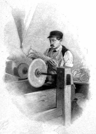 Did you watch the workmen—the "gatherer" and the "blower," with their long, hollow iron pipes? How the "blower," with his trained[Pg 42] fingers, gave an easy, constantly swaying motion to the pipe, into which he blew and expanded the hot glass at its end? The tempering oven, through which all glass productions must pass before they will resist changes in temperature or even stand transportation? Did you follow the process of cutting glass; see the wheels like grindstones, driven by steam power? Wheels of stone that come from England and Scotland, and carry with them the old-country names of Yorkshire Flag, New Castle and Craigleith, stones that are very hard and close-grained, capable of retaining a very sharp edge? Wheels of iron, which are used to cut the design in the rough; wheels of wood, cork, felt, and revolving brush wheels, used in finishing and polishing? Did you know that the trained eye of the cutter and his experience were the only guides he had to secure the requisite depth to his cutting; that he must exercise[Pg 43] great care and judgment, else the vibration of the glass renders it extremely liable to break, and that an intricate design requires many days of constant manipulation?