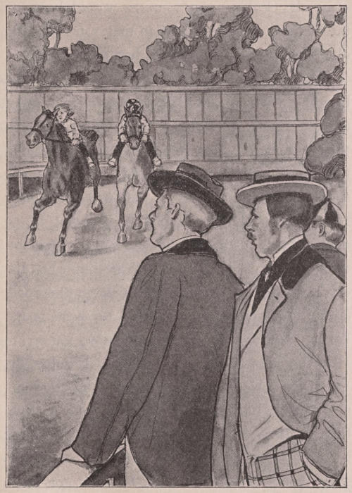 Both children could be distinctly seen, though now half way round the bend, and breathlessly the men stood and watched. Mr. Tayloe’s face[18] was deathly white, and his hands shook as he grasped the gate-post at the entrance to the track. The rest, however, had forgotten who were on the horses. It was a race that they were watching, and so intense was the interest that they almost held their breath as again the children appeared in sight, for neck and neck they were going now. Both horses were being ridden at break-neck speed. All sense of servant and master was forgotten in Peter Black’s and Bobbie’s minds; it was a race to win, and all else save winning was driven out. Nearer and nearer they came, and up through the stillness of the early morning could be heard the ringing of the horses’ hoofs upon the hard-packed track; and now they could see that each was stretched almost flat upon the back of his horse, holding on in some mysterious way known only to himself.