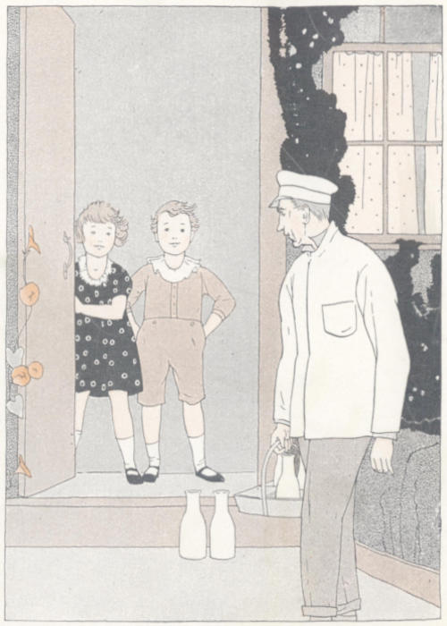 Dramatic play. Let the children dramatize these lessons, using their own experiences with the iceman, milkman, and other workers as well as the materials given in the text. If at first they act the story in pantomime, let them do so. Young children have difficulty in the use of language and can secure more rapid action by means of gestures and pantomime. Such play develops clear mental pictures which soon find expression in words. It is well to give children freedom in dramatic play. Such freedom will not be abused if responsibility is placed upon them and if an atmosphere is[195] secured which promotes concentration. The first plays should be very simple ones consisting of the action in one place. Sometimes it may be the representation of Bobby and Betty talking with their mother; again it may be at the baker’s shop, and again on the way home. Children quickly discover the natural divisions of a play and become interested in playing the whole story and thus finding a way of representing different scenes in an act. The dramatic play from day to day requires nothing in the way of costume; but, if later it seems best to represent a more finished play, the children will enjoy planning and making simple caps, aprons, coats, and dresses of paper or inexpensive material for the various characters. A procession of workers will prove interesting, each child representing one of the characters. Each one should be asked to do something which the worker he represents might do, whether it be the imitation of movements, an action song, or repeating an appropriate jingle. A delightful entertainment easily grows out of the work from day to day.