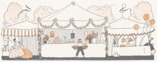 The milliner’s shop suggests the making of hats. Whether these be simple hats for a toy milliner’s shop, dolls’ hats of flowers of the season or other available material, or hats for Simple Simon, Colly-Molly-Puff, the Rabbit Woman, or any other character of the book, may be determined by the conditions when the study is made. The making of hats, caps, aprons, and other characteristic garments of the workers to be used in dramatic play provides another form of interesting and profitable work.