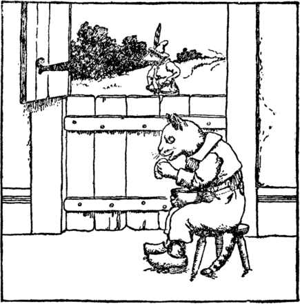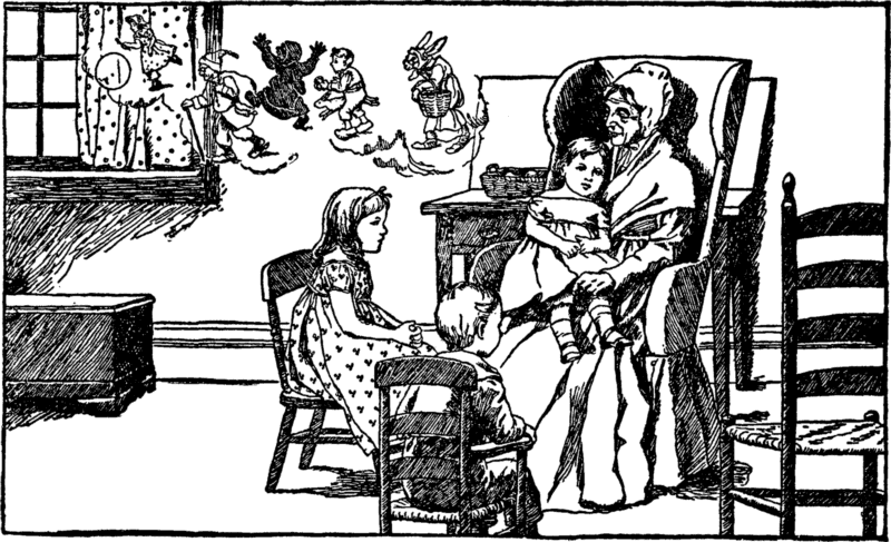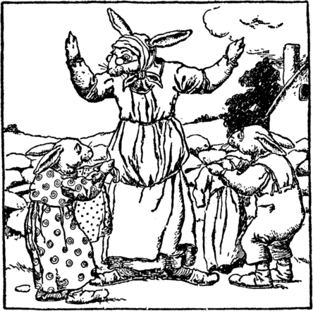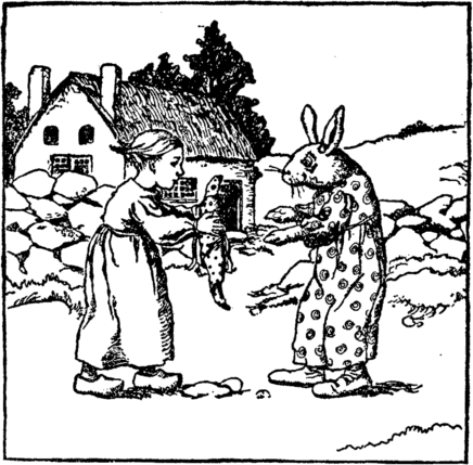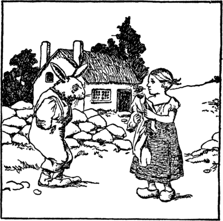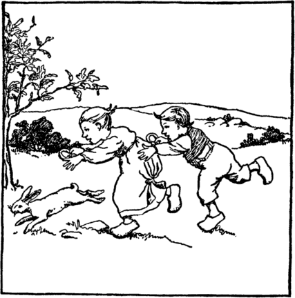 "Now," cry the rabbits, "we will play, For these girls cannot run away." But while they rock their dolls and sing The witch brings home her marketing. "Where are you children dear," she cries. The little rabbit boy replies;— |