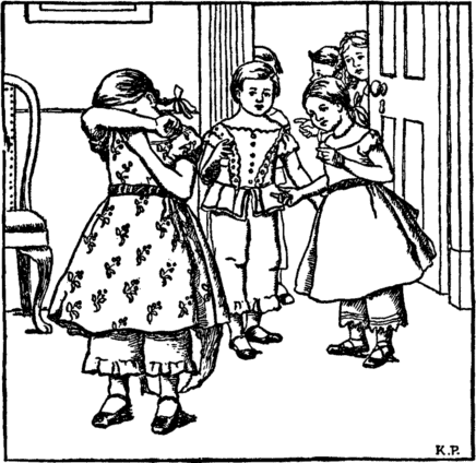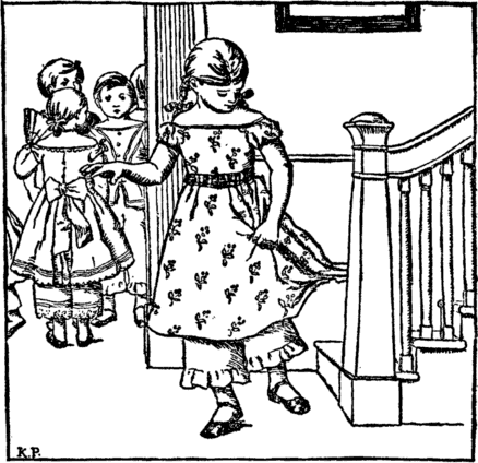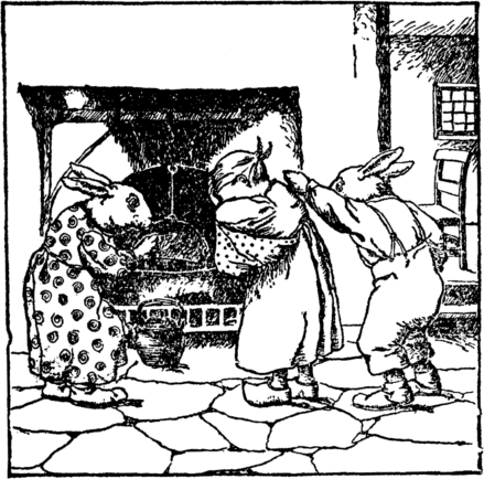 "Just see this apron-girl," she cries;— "Look at it's nose and button eyes." And now her frock with belt and fold Into another doll is rolled; She gives it to the rabbit boy, Who squeaks and stamps his foot with joy. |