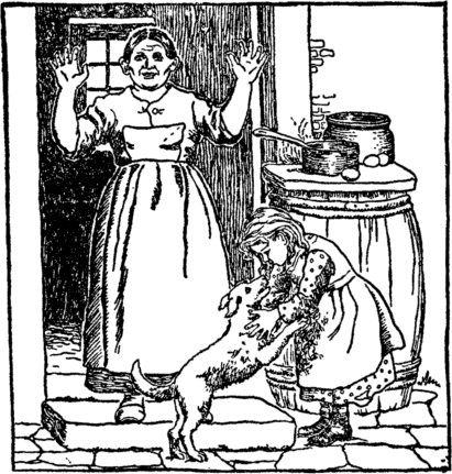 But as Ann, weeping, turned away, Her little dog ran out, And he began to lick her hands, And bark and jump about. "Why, why," cried cook, "I never saw Dog Towzer act that way, Except when little Ann came home From school or after play." |