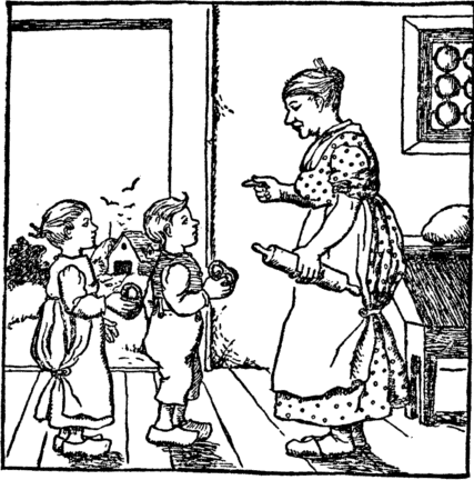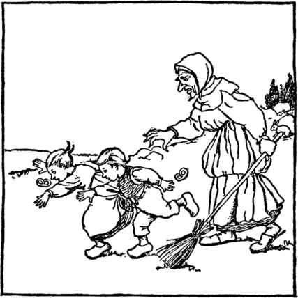 And now pell-mell away they run; But down the chimney place The boys climb ere the ogress Can clean her sooty face; And when they're safely home again They keep the master's rule, And never, never play again At truant from the school. |