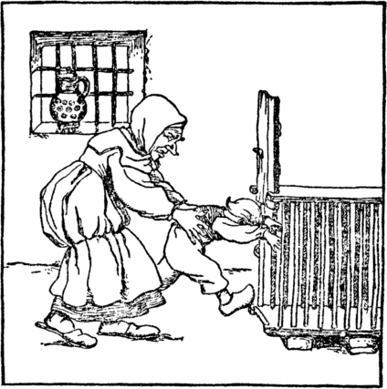 The old witch then puts on the pot, That she may boil Hans when it's hot. |