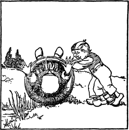 At last the sand-man, weary grown, Sat down to rest upon a stone. Then Frederick turned himself about, And quick he whipped his jack-knife out; Ke—scritchy—scritch! He cuts a slit And softly clambers out of it. And now he runs as quick as thought, And soon a heavy stone has brought; |