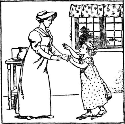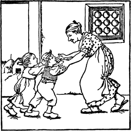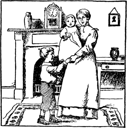 And see! her little girl and boy The mother welcomes home with joy. |