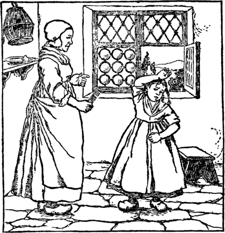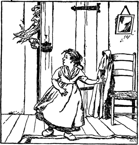 "Get up," cries Mother Webtoes; "The breakfast you must get." "Oh let me stay in bed," says Jane; "The floor is cold and wet." But Mother Webtoes stamps her foot, And makes the child arise; But as Jane sobs, behind the door, Ah, what is this she spies? |