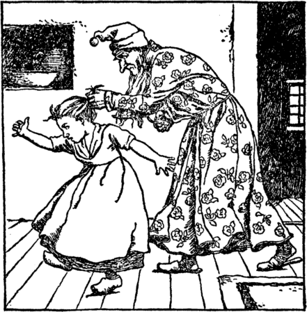 In through the door he looked, and said, "What! Frederick will not go to bed?" In vain did Frederick kick and bawl, The sand-man would not heed at all; He tumbled Fred into his sack, And off he bore him on his back; Away he went out through the door, On, on for many a mile and more. |
