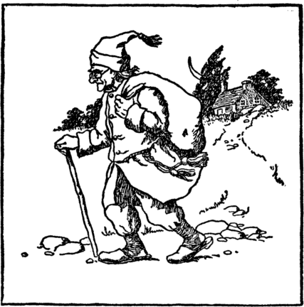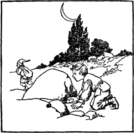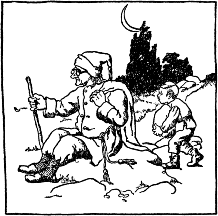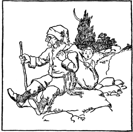 He softly slips it in the sack That hangs upon the sand-man's back. Says clever Fred, "He will not see He has a stone instead of me." And now the sand-man grunts and sighs, And slowly he begins to rise. |