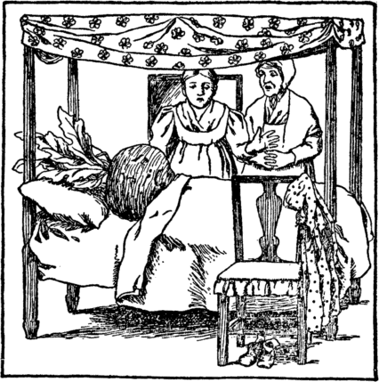 And in the bed the beet leaves green Instead of arms and legs were seen; And then in came mamma and nurse; They did not know her, which was worse, But Jane could hear mamma; she said, "Why, why! how came this beet in bed?" |