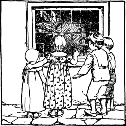 But clever Peter sees above The chimney, black and wide; "Quick, wipe your eyes and come," he cries; "I've found a place to hide." And none too soon, for scarce the last Is out of sight before They hear the wicked ogress Come stumping in the door. |