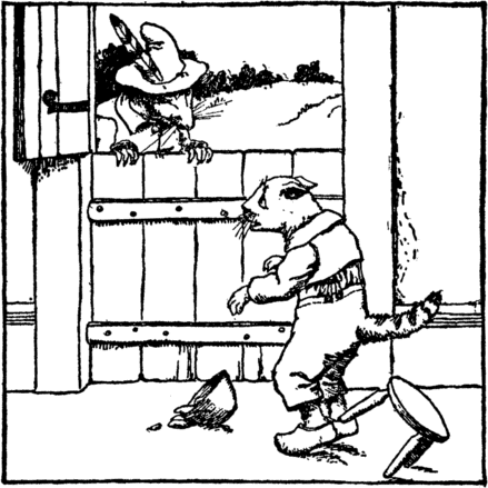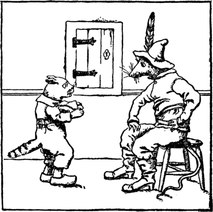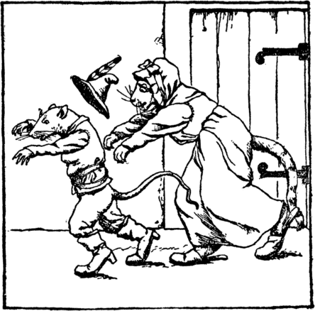 And now in marched the robber rat; "What!" cried he, "still in bed! Quick, fetch me out what cheese you have, And all your scraps of bread." "Spit-t-t!" with her claws and gleaming eyes The cat sprang out of bed. The robber gave one dreadful squeak, And then away he fled. |