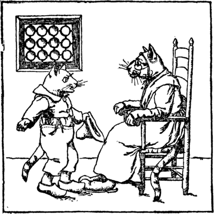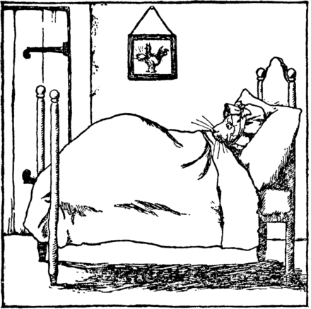 At last the kitten went to ask Advice of some old cat Who lived close by, and told her all About the robber rat. The wise old grey cat scratched her ear; "I'll fix this rat," she said; So she pulled a night-cap over her ears And lay in the kitten's bed. |