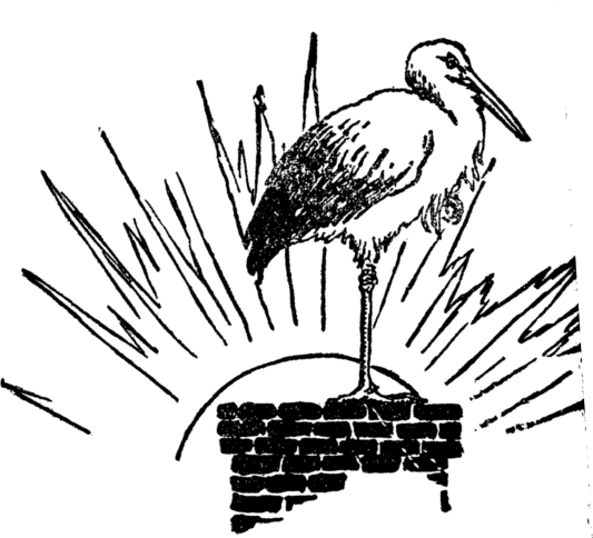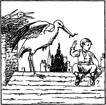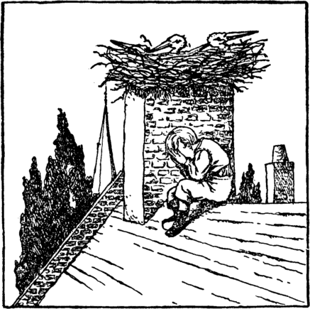 Upon the roof the little storks Live high up in the sky, And far below them in the street They hear the folks go by. The old stork brings them, in his beak, The eels and frogs for food; But these he will not let them have Unless they're very good. |
