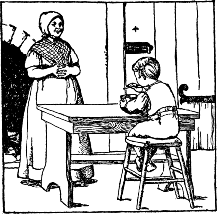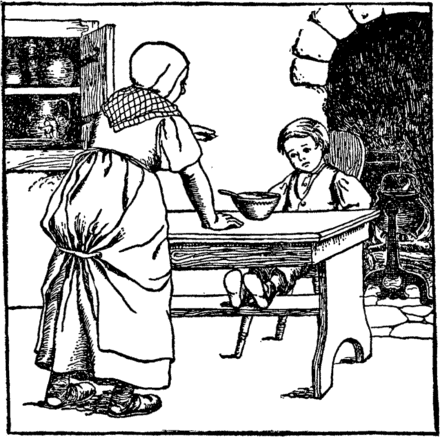 Such things poor Johnny could not eat; And as he sat and cried, He thought of all the bread and milk He used to push aside. "If I were only home again, I would be good," he said, "And never, never turn away From wholesome milk and bread." |
