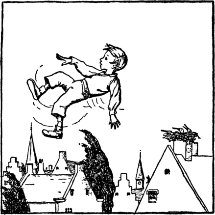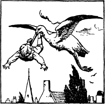 Above the chimney Father Stork Heard all that Johnny said, And how each day he pushed away The bowl of milk and bread. And so it was, when kind mamma Had left the house one day, In through the kitchen door he came And carried John away. |