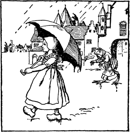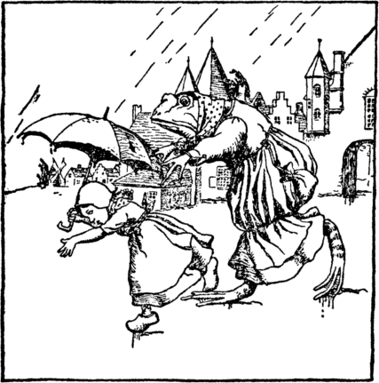 But oh, Jane was a naughty girl! On her own way intent; Soon as mamma had turned away, Out in the street she went. The streets were wet and lonely; No children there at play; Only old Mother Webtoes The frog abroad that day. |